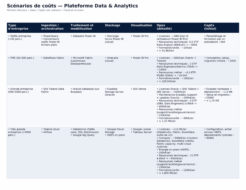 - (Cloud) Licences utilisateurs pour outils de reporting (Power BI Pro, Tableau Creator, Qlik Analyzer).